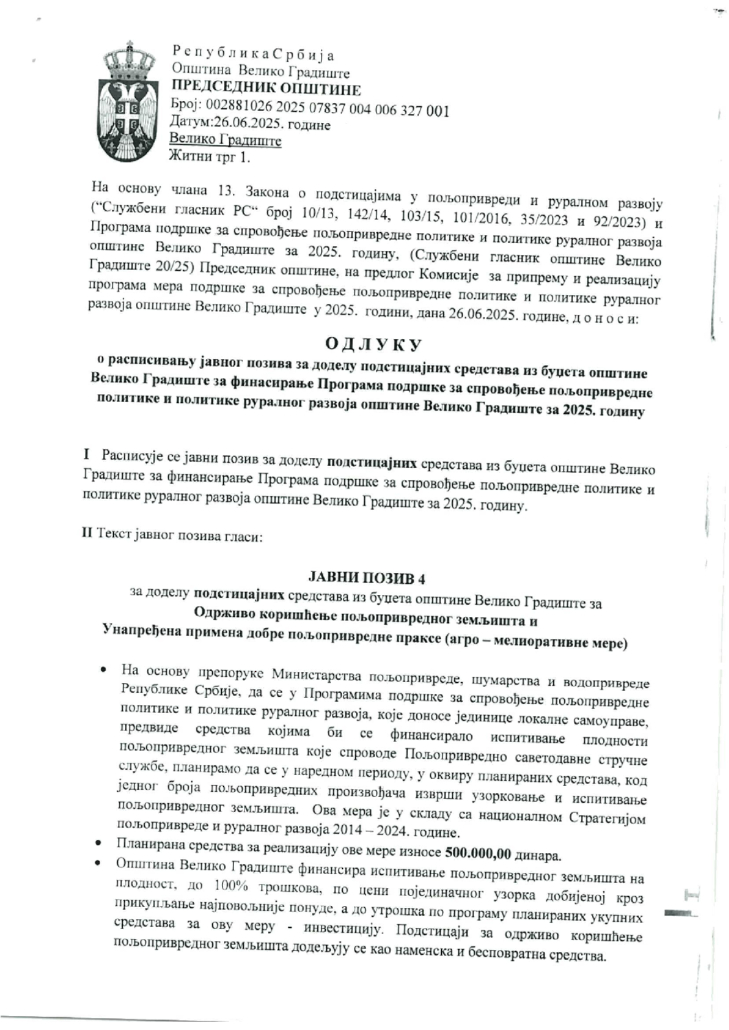 ЈАВНИ ПОЗИВ -4- за доделу подстицајних средстава из буџета општине Велико Градиште за Одрживо коришћење пољопривредног земљишта и Унапређена примена добре пољопривредне праксе (агро–мелиоративне мере) 27. јун 2025./by Urednik 1