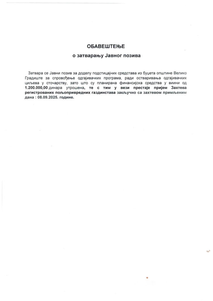 Oбавештење о затварању Јавног позива за спровођење одгајивачких програма, ради остваривања одгајивачких циљева у сточарству 23. септембар 2025./by Urednik 1