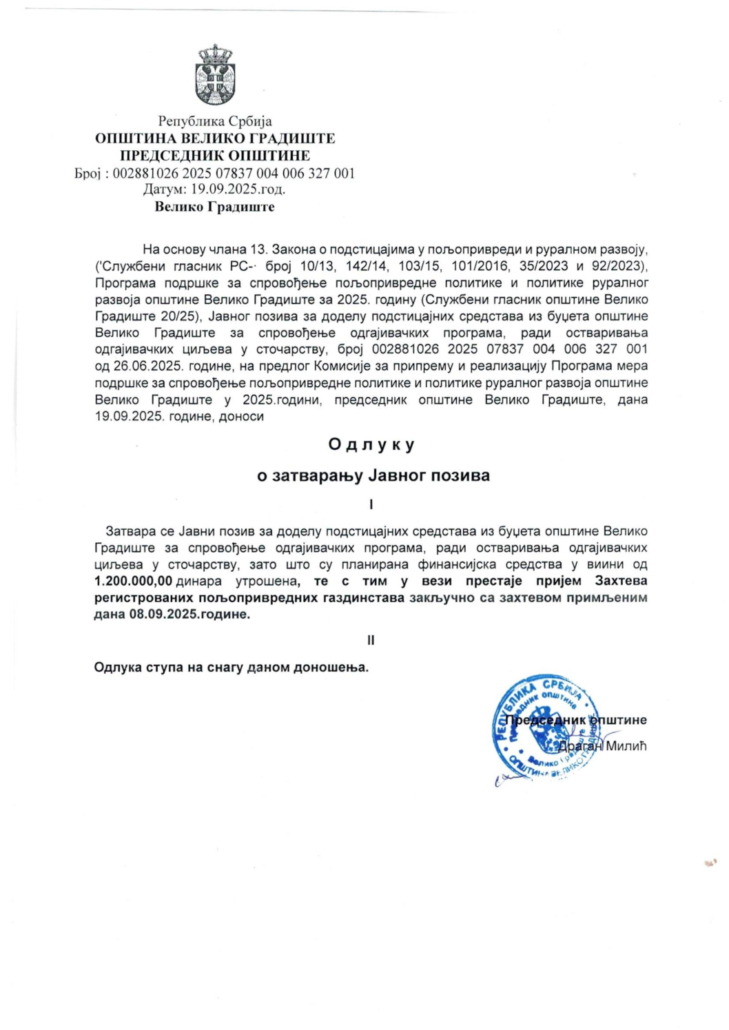 Одлука о затварању Јавног позива за спровођење одгајивачких програма, ради остваривања одгајивачких циљева у сточарству 23. септембар 2025./by Urednik 1