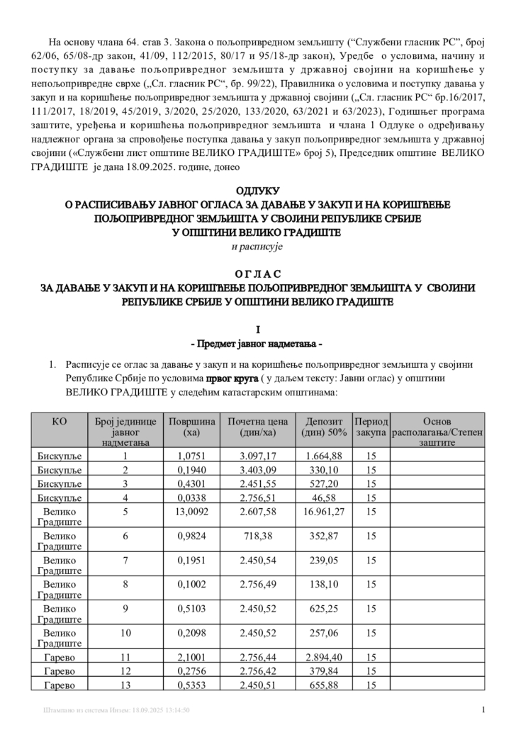 Оглас за давање у закуп и на коришћење пољопривредног земљишта у својини Републике Србије у општини Велико Градиште 18. септембар 2025./by Urednik 1