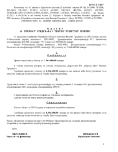 20. Предлог Одлуке о преносу средстава у текућу буџетску резерву – ПУ Мајски цвет – разно