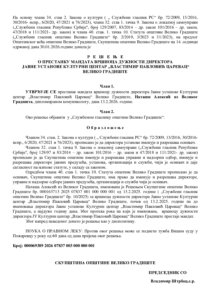 36. Решење о престанку мандата в.д. директора ЈУ Културни центар „Властимир Павловић Царевац“ из Великог Градишта,